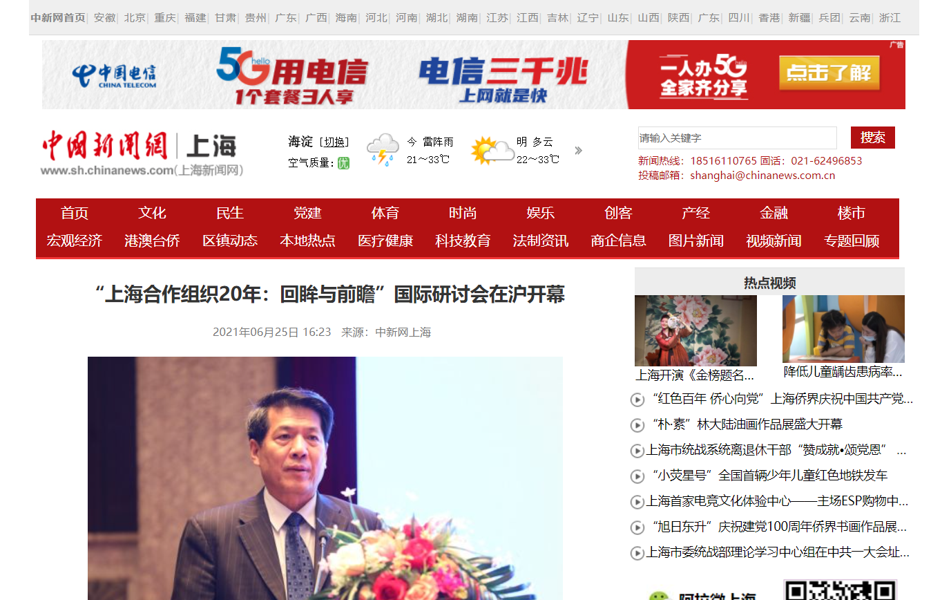 6月24日,“上海合作组织二十年:回眸与前瞻”国际研讨会在沪隆重举行。此次会议得到外交部支持,由中国上海合作组织研究中心、中国国际问题研究院和上海合作组织秘书处联合主办,上海政法学院、中国-上海合作组织国际司法交流合作培训基地承办。外交部、商务部、上合组织秘书处、上合组织成员国驻华使馆、上合组织成员国专家学者及媒体代表近200人出席。在本次开幕式中还举行了2021上合组织蓝皮书《上合组织20年:成就与经验》发布仪式。本书由中国上海合作组织研究中心编写,徐步主编、邓浩执行主编。