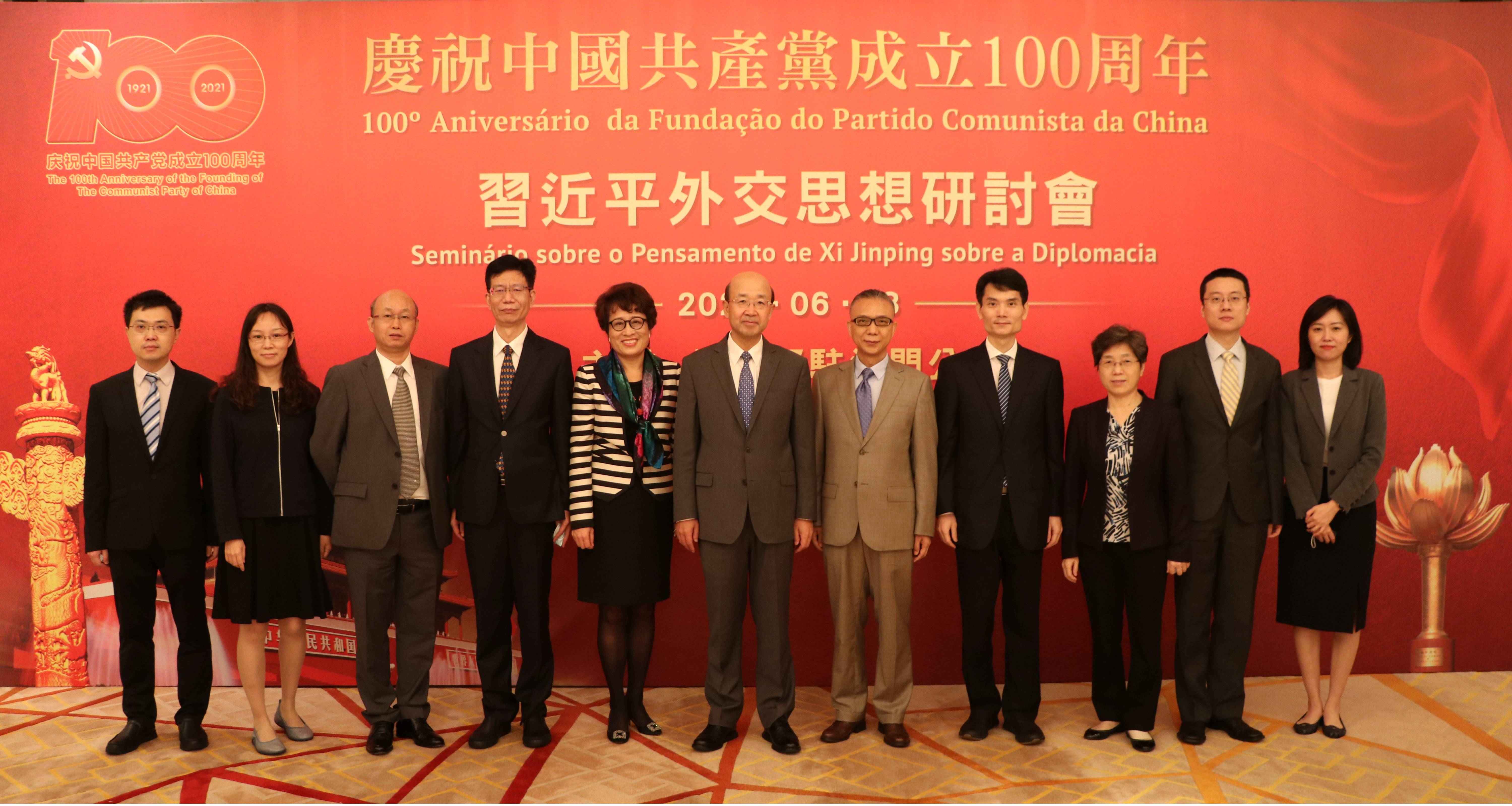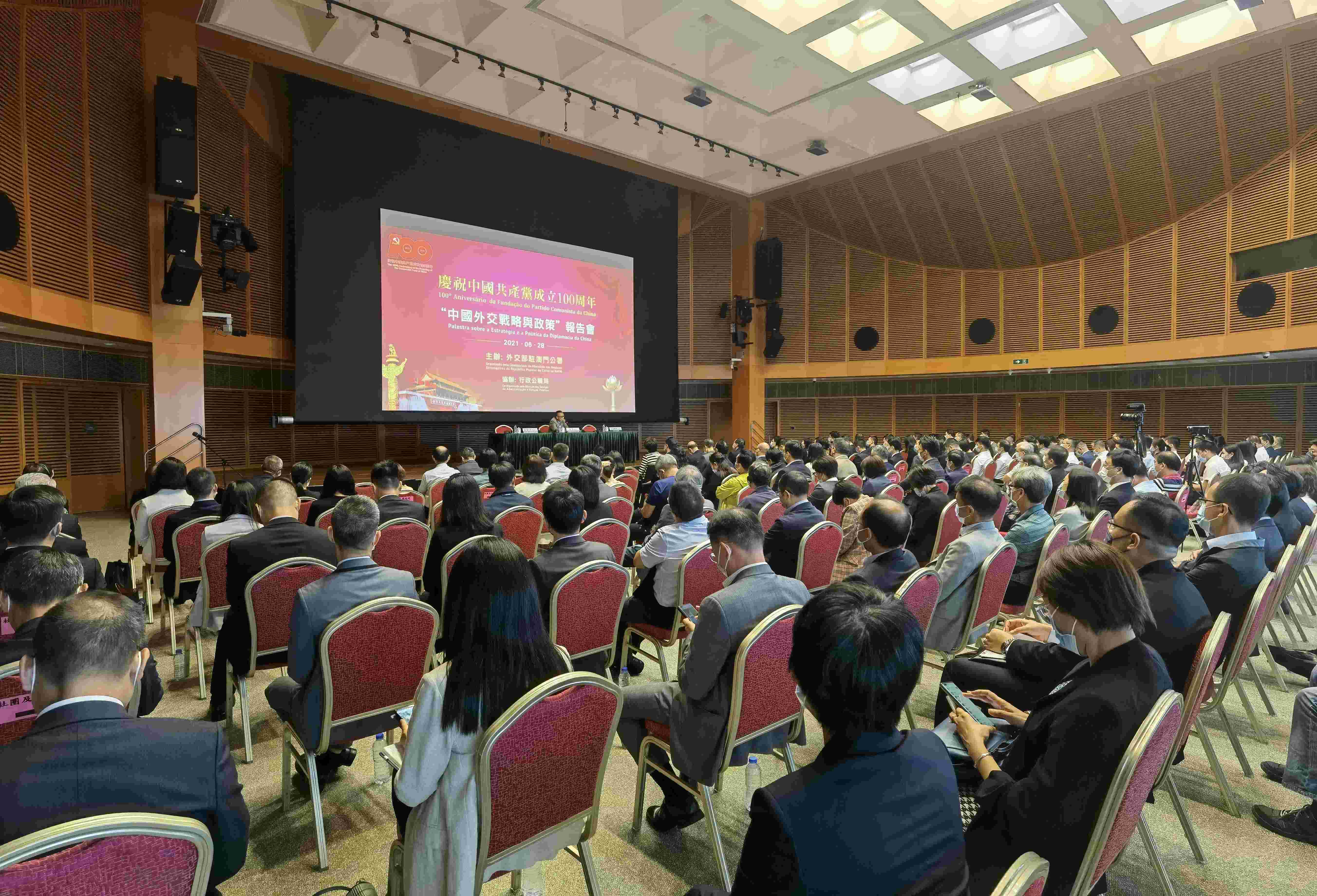 为庆祝中国共产党成立100周年,外交部驻澳门公署主办“习近平外交思想研讨会”和“国际形势与中国外交战略”报告会,外交部驻澳门公署特派员刘显法发表讲话,特区行政法务司司长张永春、特区行政公职局局长高炳坤致辞。