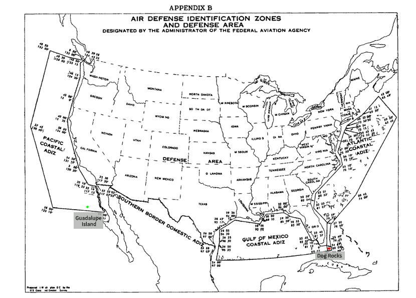墨西哥的瓜达卢佩岛(绿点所示)大致坐标为29°01′24″N 118°16′21″W,巴哈马的多格岩(红点所示)大致坐标为24°03′27″N 79°52′14″W,皆在上图所示美国相关ADIZ范围之内。
