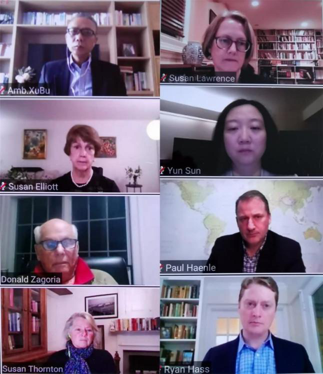 3月26日,中国国际问题研究院院长徐步应邀出席美国外交政策全国委员会(NCAFP)举行的中美关系视频研讨会。美方出席的有美国外交政策全国委员会主席苏珊·艾略特(Susan M. Elliott)大使、美国外交政策全国委员会亚太安全论坛主任董云裳(Susan A. Thornton)、布鲁金斯学会外交政策项目资深研究员何瑞恩(Ryan Hass)、清华—卡内基全球政策中心主任韩磊(Paul Haenle)等;中方出席的有北京大学国际关系学院前院长贾庆国教授、中国现代国际关系研究院前院长崔立如教授等。