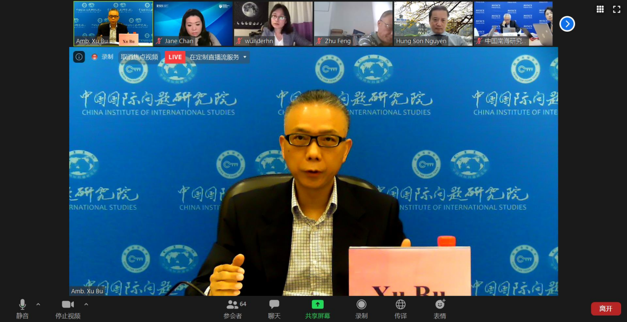 8月26日,中国国际问题研究院院长徐步应邀出席中国南海研究院主办的“中国—东盟南海问题智库对话”线上国际研讨会。中国南海研究院创始院长、中国—东南亚南海研究中心理事会主席吴士存和印尼战略与国际问题研究中心共同创始人、中国—东南亚南海研究中心理事会副主席尤素夫·瓦南迪分别致开幕辞。徐步院长主持对话会有关“当前南海新形势”议题讨论。