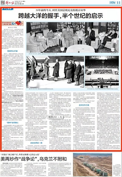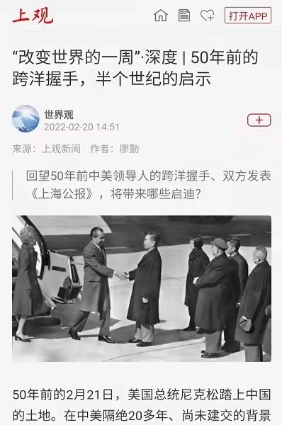 2022年2月21日,《解放日报》发表《跨越大洋的握手,半个世纪的启示》,该文亦发表在解放日报社“上观新闻APP”。
