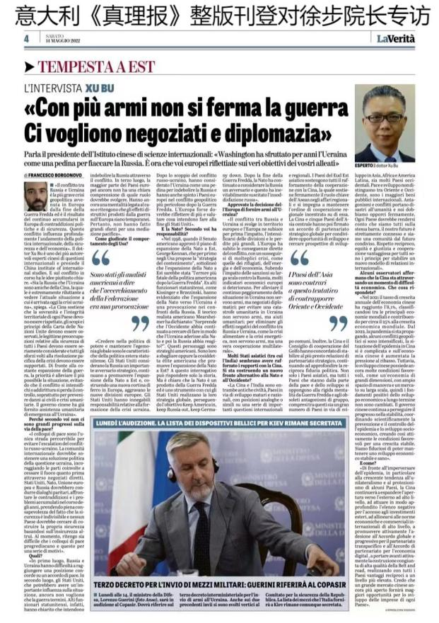 5月14日,徐步院长接受意大利主流媒体《真理报》专访,就中国如何看待乌克兰局势、美国和北约在俄乌冲突中的角色、中俄关系及中国经济和地缘政治是否受俄乌冲突影响等回答记者提问。