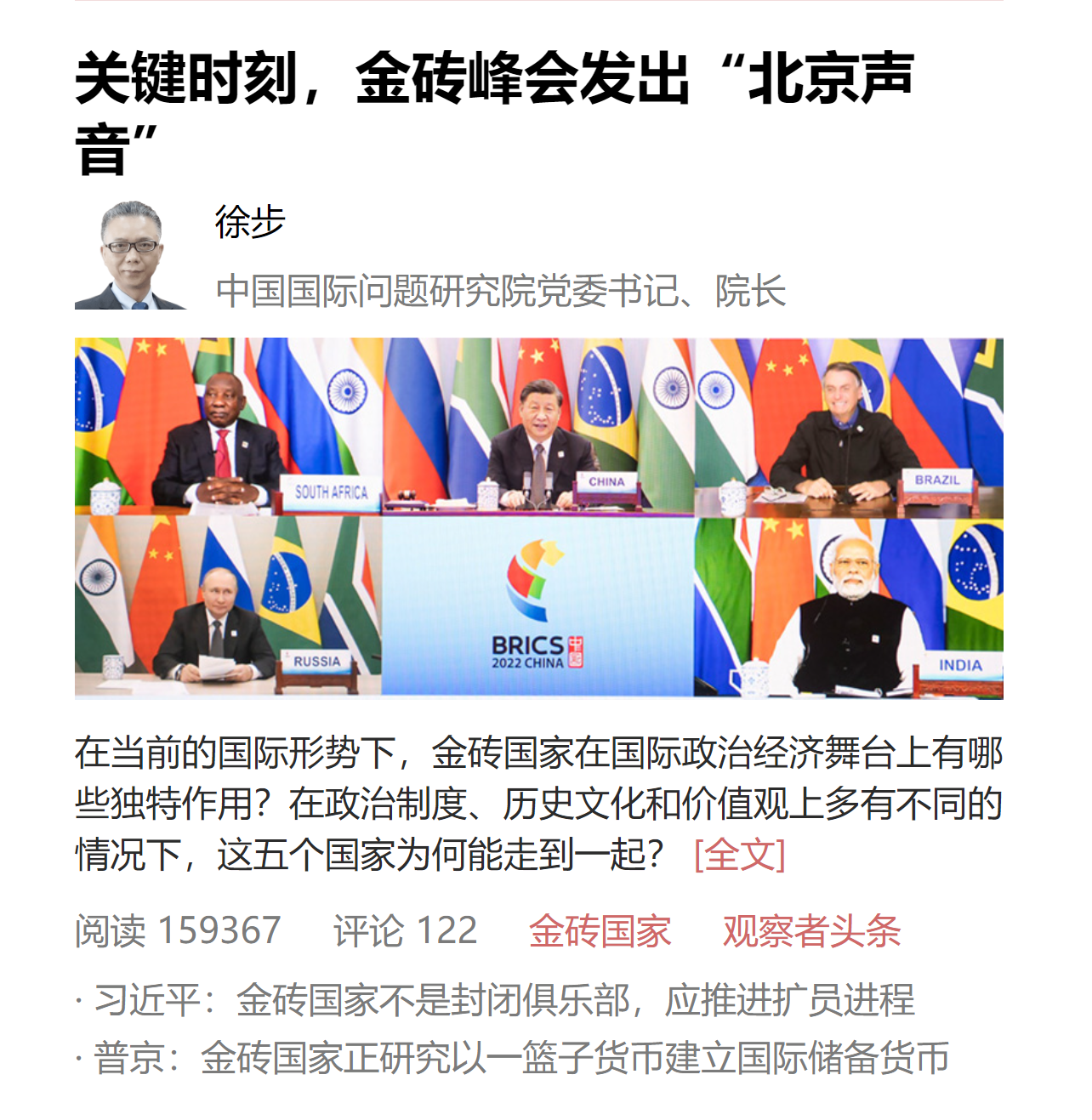 6月25日,观察者网刊登对中国国际问题研究院徐步院长采访文章,标题为《关键时刻,金砖峰会发出"北京声音"》,全文转载如下。