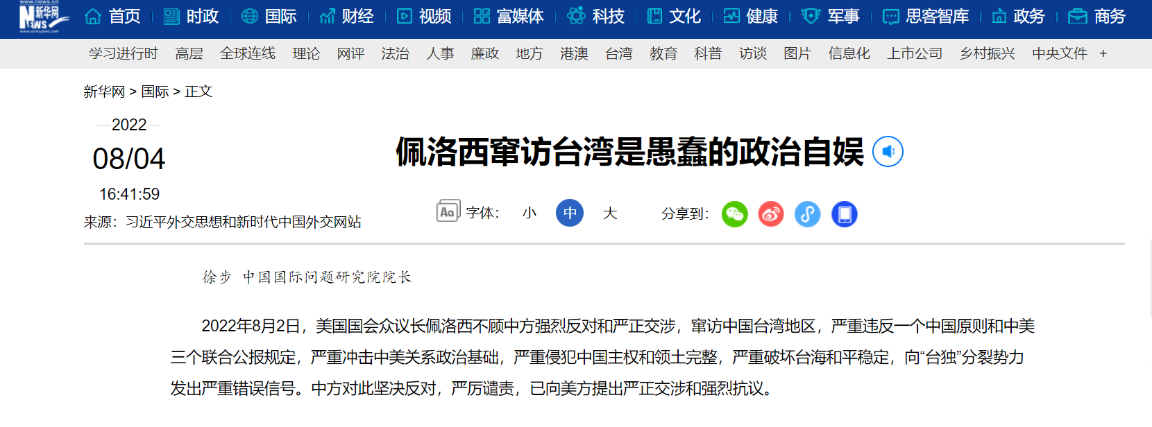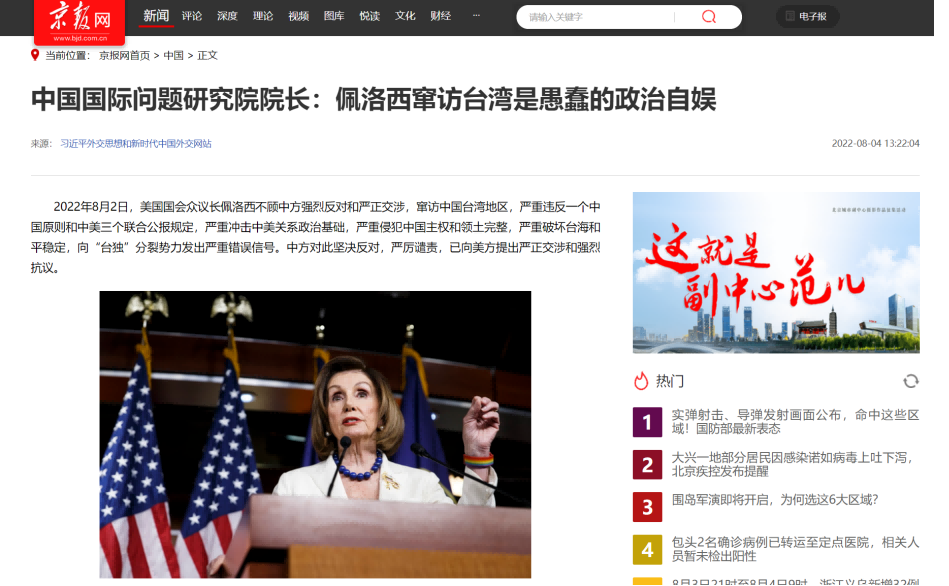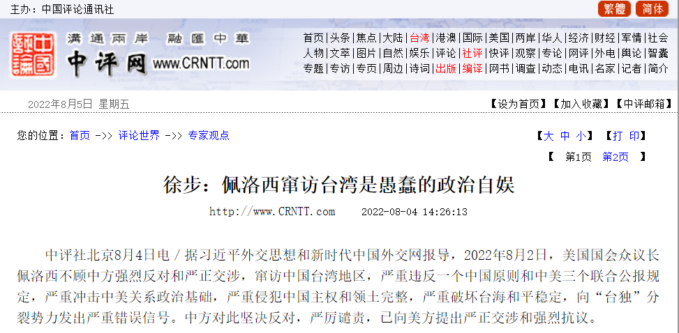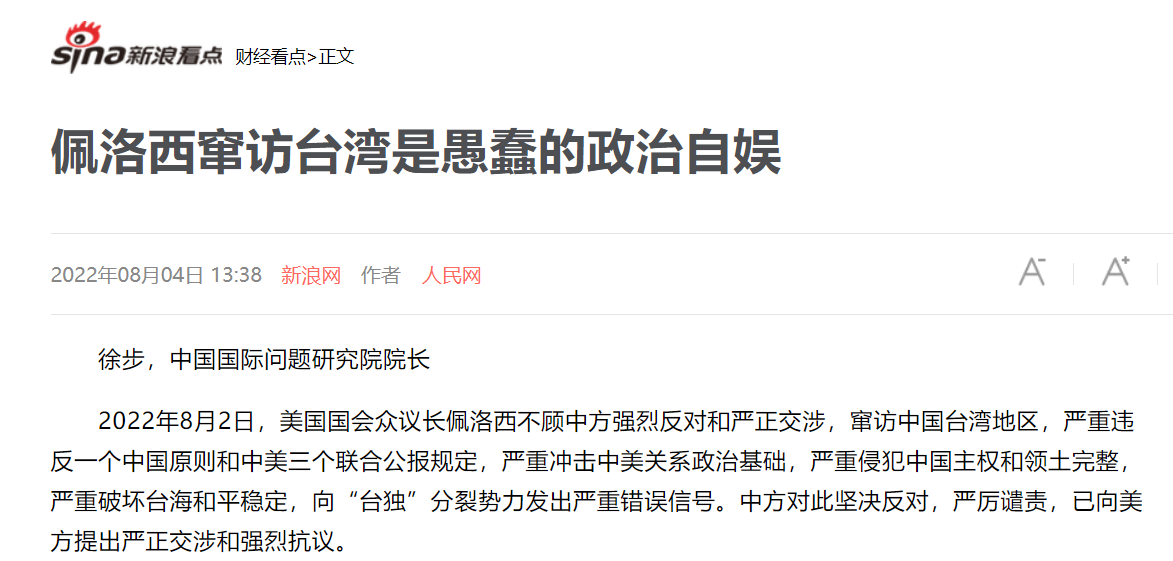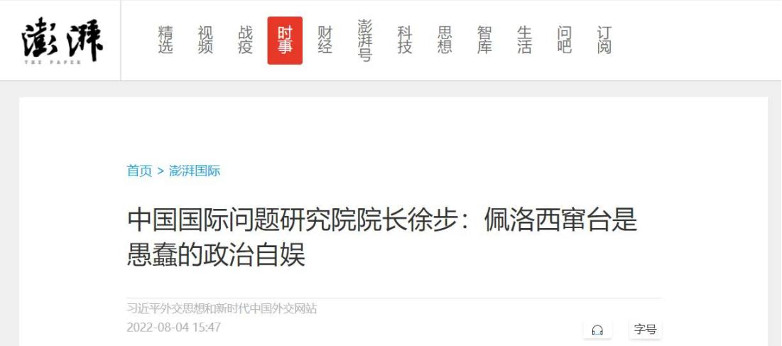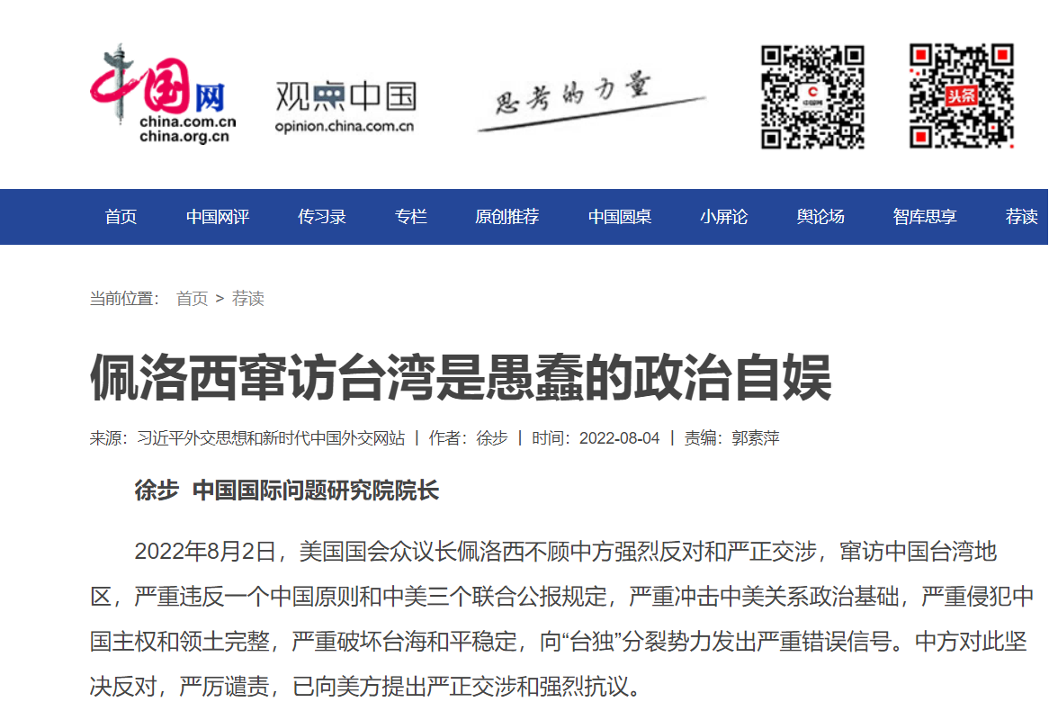 中国国际问题研究院徐步院长8月4日在中国网首发文章《佩洛西窜访台湾是愚蠢的政治自娱》,各大网媒纷纷转载,引起广泛关注。
