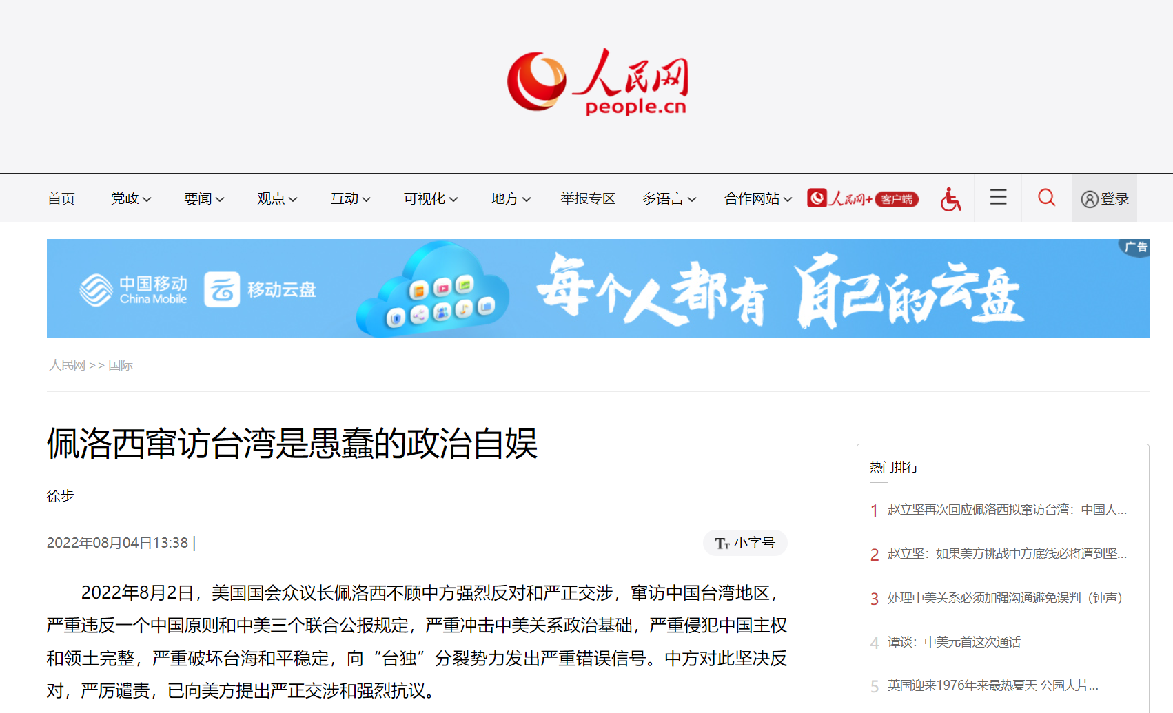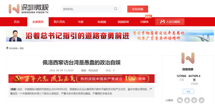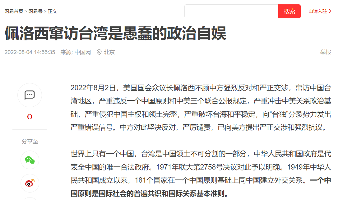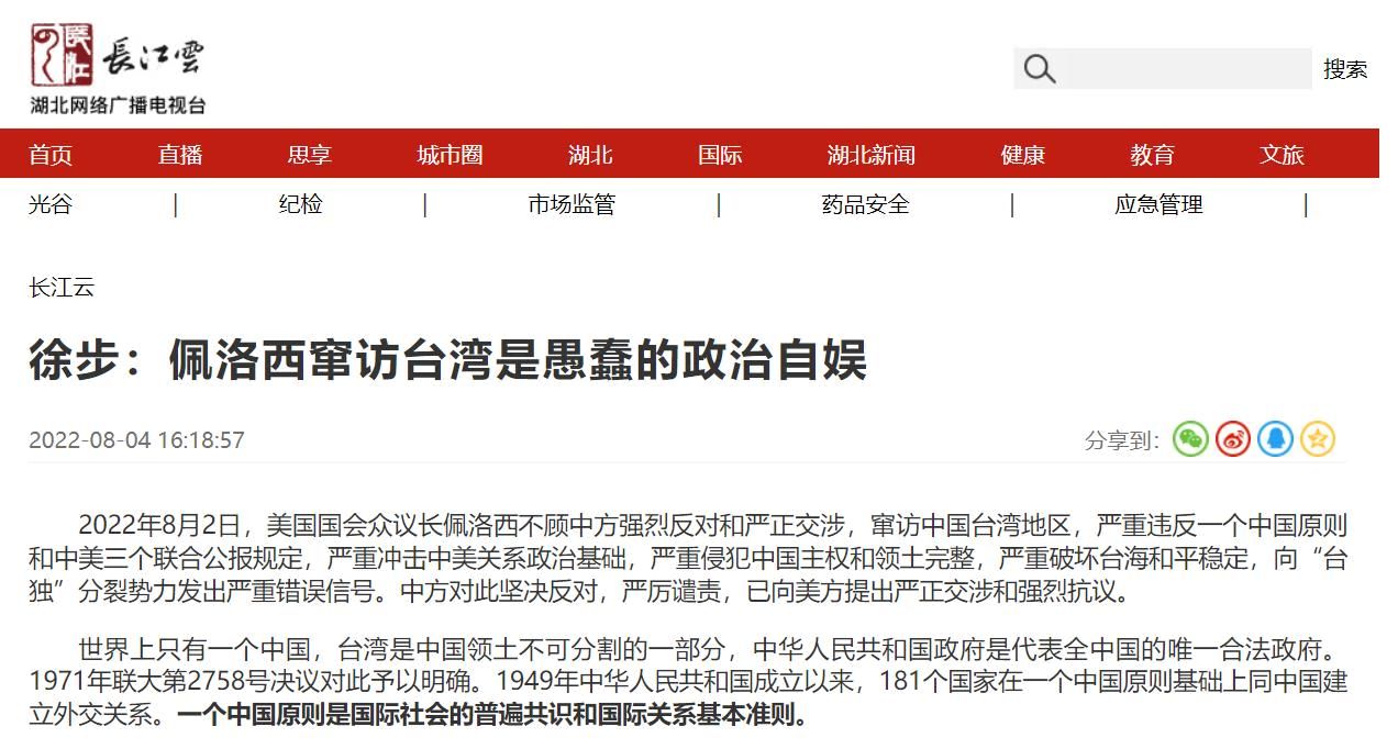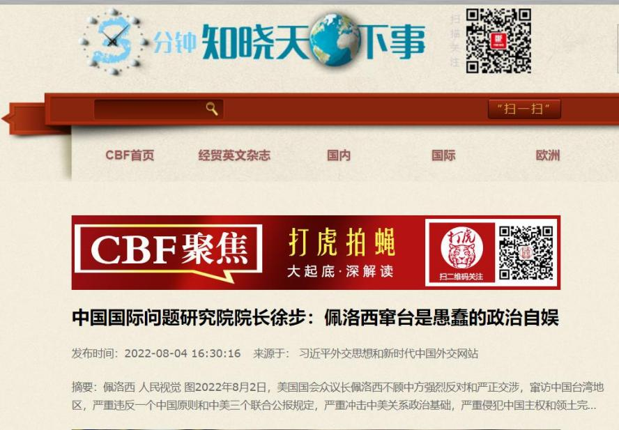 中国国际问题研究院徐步院长8月4日在中国网首发文章《佩洛西窜访台湾是愚蠢的政治自娱》,各大网媒纷纷转载,引起广泛关注。