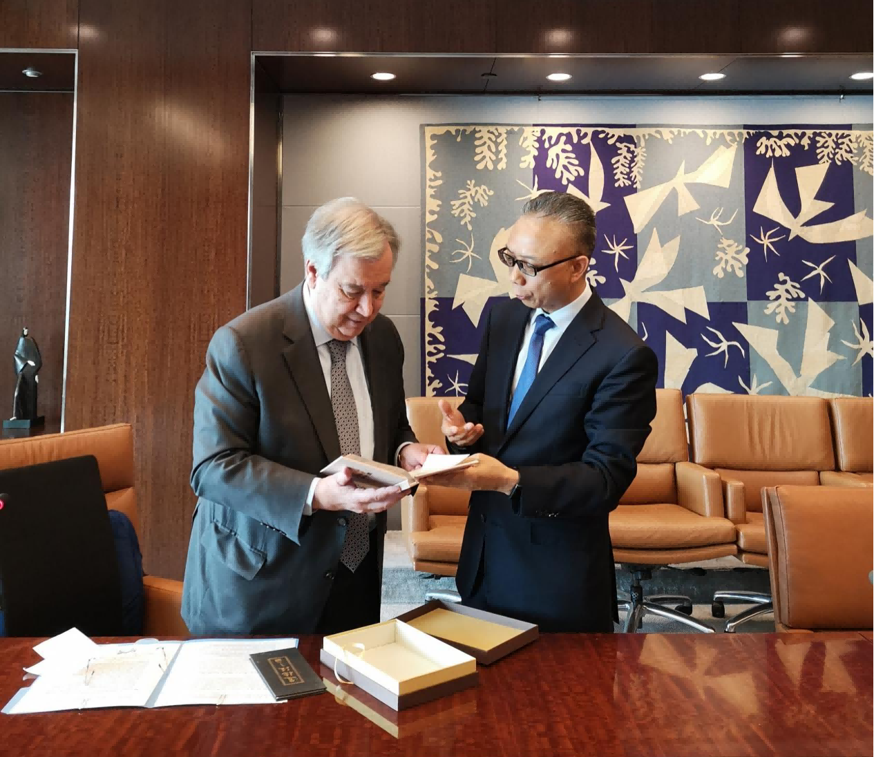 徐步院长表示,很荣幸应秘书长邀请,作为咨询委员会成员参与全球治理磋商进程,为推进有效的多边主义贡献力量。当前,全球性及跨国性挑战日益突出,联合国的作用进一步凸显,国际社会对联合国抱有很大期待。相信在古特雷斯秘书长领导下,联合国将在应对各国面临的共同挑战方面发挥更大作用。徐步院长向古特雷斯秘书长赠送了中国古代经典《道德经》。