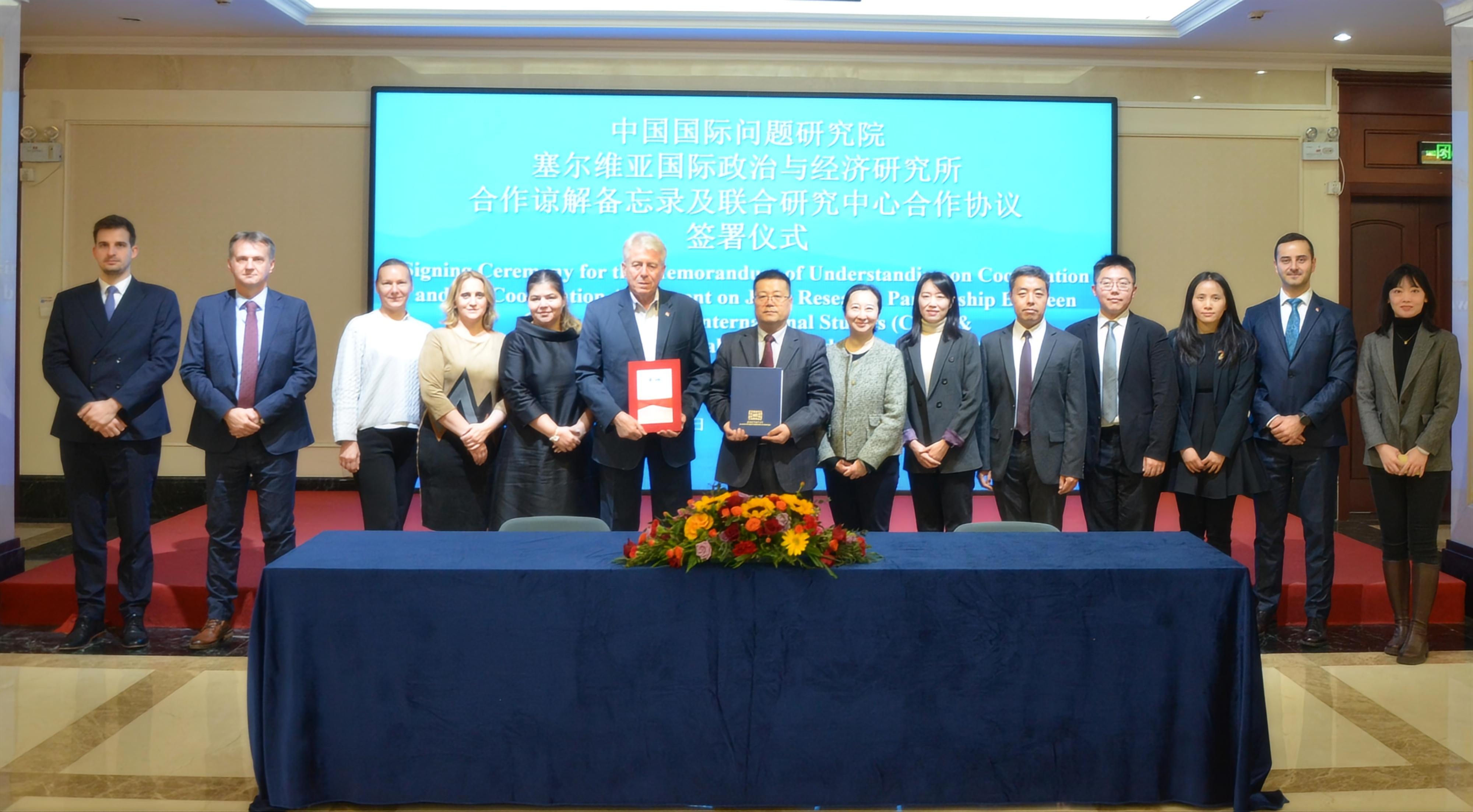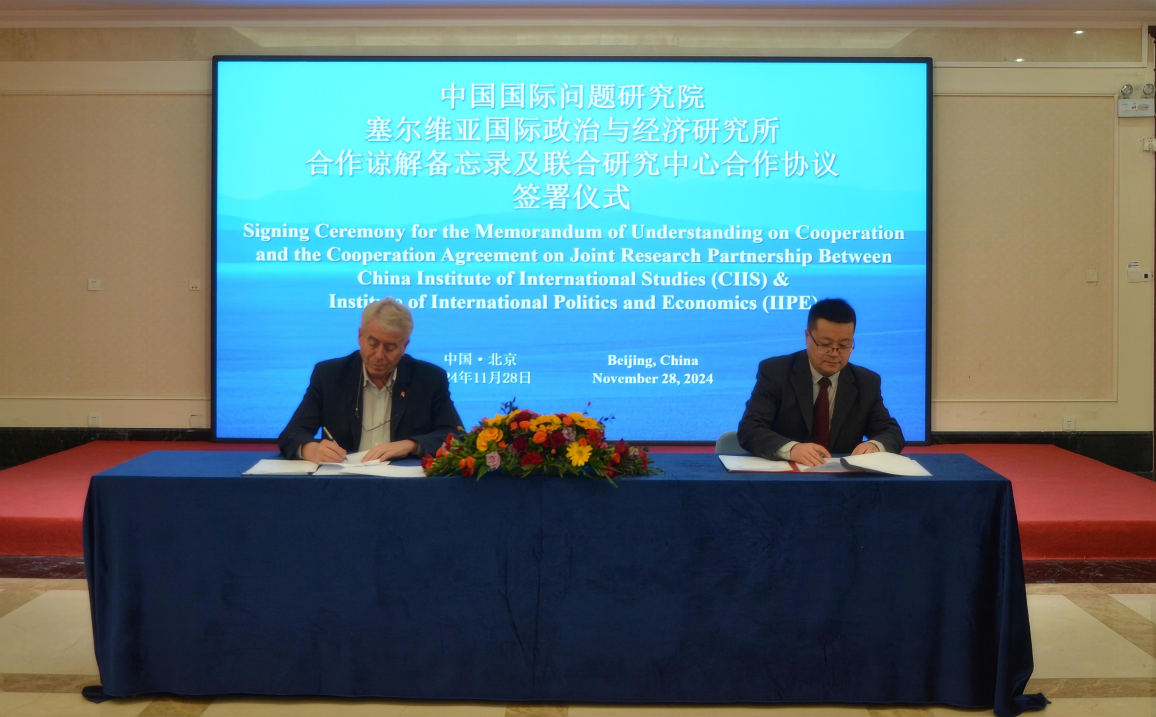 11月28日,中国国际问题研究院与塞尔维亚国际政治与经济研究所合作谅解备忘录及联合研究中心合作协议签署仪式在京举行。国研院副院长刘飞涛及塞尔维亚国际政治与经济研究所所长乔尔杰维奇分别代表双方机构签署有关文件。塞尔维亚驻华大使玛娅·斯特凡诺维奇出席签署仪式。