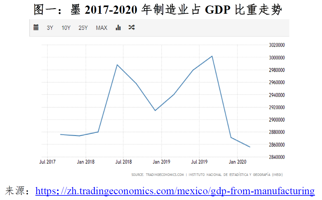 此外,几组重要的墨国内制造业数据也显示出其承接美制造业转移未来仍面临较大不确定性。其一,墨制造业占国内生产总值比重的走势并非持续向好。2018-2020年初,该数据呈现出“M”状发展趋势(见图一),表明墨制造业景气程度起伏较大,并未出现持续繁荣。