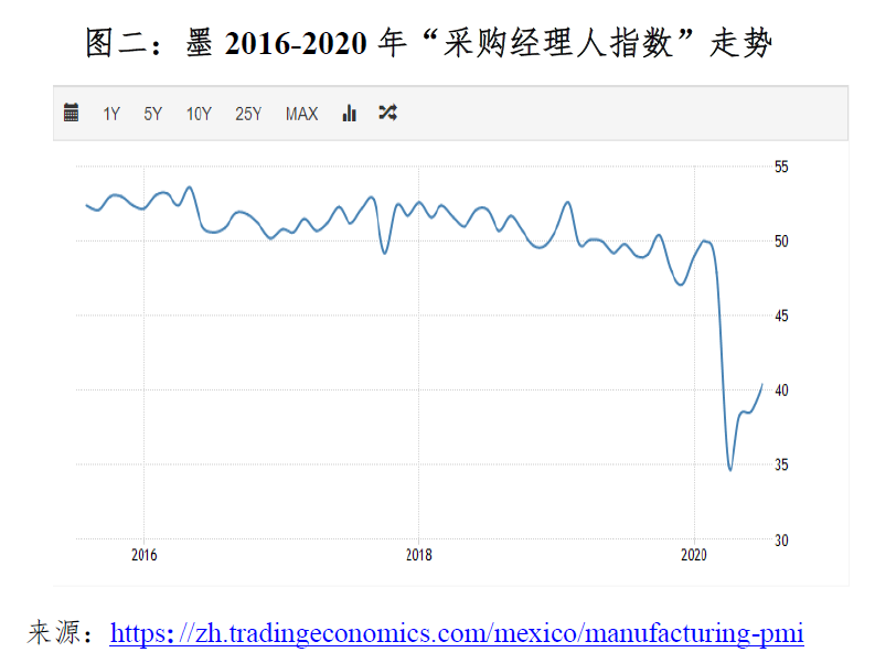 其二,2018-2019年间,墨“采购经理人指数”(PMI)围绕荣枯线上下震荡,并于2020年初大幅滑落,显示其制造业当前正经历深度回调(见图二)。