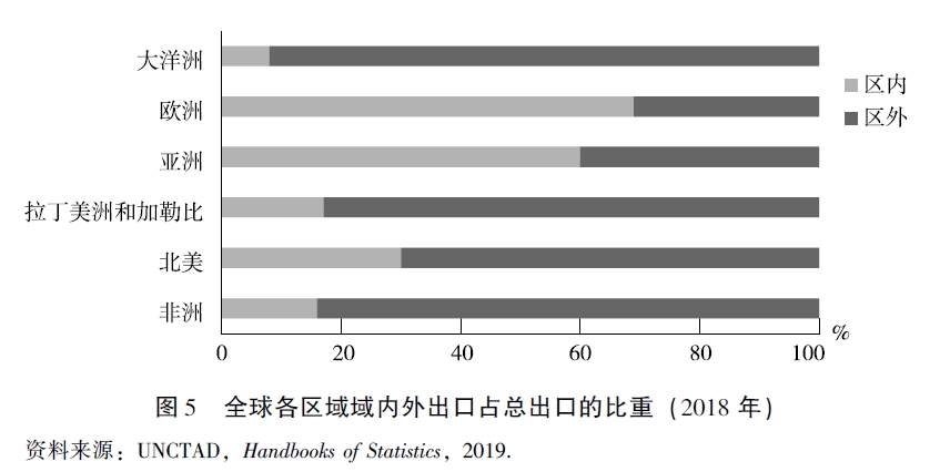拉美提升经济一体化水平、结成区域层次的共同关税同盟还有很长的路要走。首先,纵观半个多世纪的一体化历程,拉美从未建成一个能够覆盖全地区、包括所有国家的经济一体化组织。以太平洋联盟为代表的次区域组织虽然发展尚可,但内部经贸联系不够紧密,经贸重心外趋性特征明显。联合国贸发会议数据显示,2018年拉美地区区域内出口占总出口比重为16%,远低于欧盟(63.6%)和亚洲(53.7%)(见图5)。其次,一体化推进障碍加大。近年来,拉美政局持续演变,多国意识形态分歧加剧,重创拉美团结合作,新冠疫情虽为拉美地区合作提供了新契机,但不足以推动地区一体化出现突破性进展。最后,区域经济一体化程度是由成员国的经济发展水平和产业分工程度决定的,在工业化程度不高时应避免盲目追求经济关系的高度一体化。拉美国家普遍工业化水平较低,不具备实现经济一体化的现实基础。