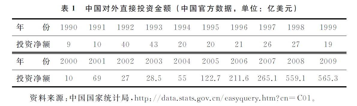 从企业“走出去”的实际情况来看,新世纪之前中国对外直接投资的存量和流量都较小,规模零星。根据联合国贸发会议世界投资报告的数据 ,除2001年中国对外直接投资流量达69亿美元外,1990年—2000年这十年间年度流量均维持在45亿美元以下,绝大多数年份处于30亿美元以下。中国官方对于对外直接投资的统计始肇于2003年,由商务部和国家统计局共同编制年度《中国对外直接投资统计年报》,此后国家外汇管理局也参与编制这一报告。自2003年开始,中国对外直接投资年度流量呈现快速增长趋势。