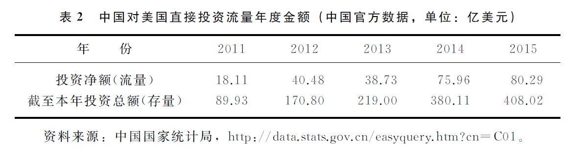 2011年—2015年这五年,中国对美直接投资实现了快速发展,从流量和存量来看均翻超过两番。根据中国官方统计,年度流量从2011年的18.11亿美元快速增长为2015年的80.29亿美元,年度存量从2011年的89.93亿美元大幅增长为2015年的408.02亿美元,各年度来看均实现稳步增长。同期,美国经济分析局统计的数据,虽在统计方法和数据结果上有所不同,但趋势和中国官方数据呈现一致性。