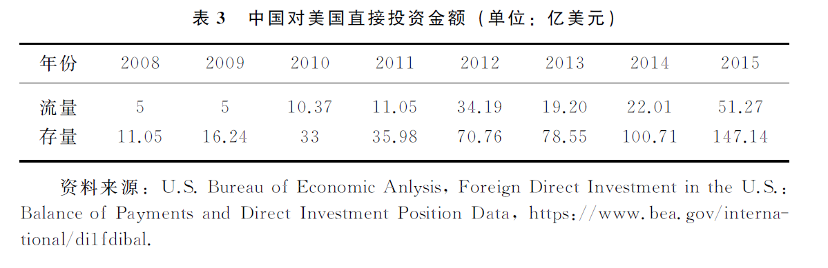 就中国对美国的直接投资而言,根据中国官方可得统计数据,2003年中国对外直接投资总额(流量)29亿美元,截至当年中国累计对外直接投资总额(存量)334亿美元,2003年中国对美直接投资流量为0.65亿美元、位列流量第6位,截止2003年存量为5.02亿美元、位列存量第四(次于香港、开曼群岛和英属维尔京群岛),实际位列中国对主要发达国家对外直接投资的首位。自此以后,中国对美直接投资年度流量缓慢攀升,在2010年之前未能突破10亿美元,2009年流量为9.09亿美元、截至2009年存量为33.38亿美元,2010年流量突破10亿美元大关达到13.08亿美元、截至2010年存量为48.74亿美元 。