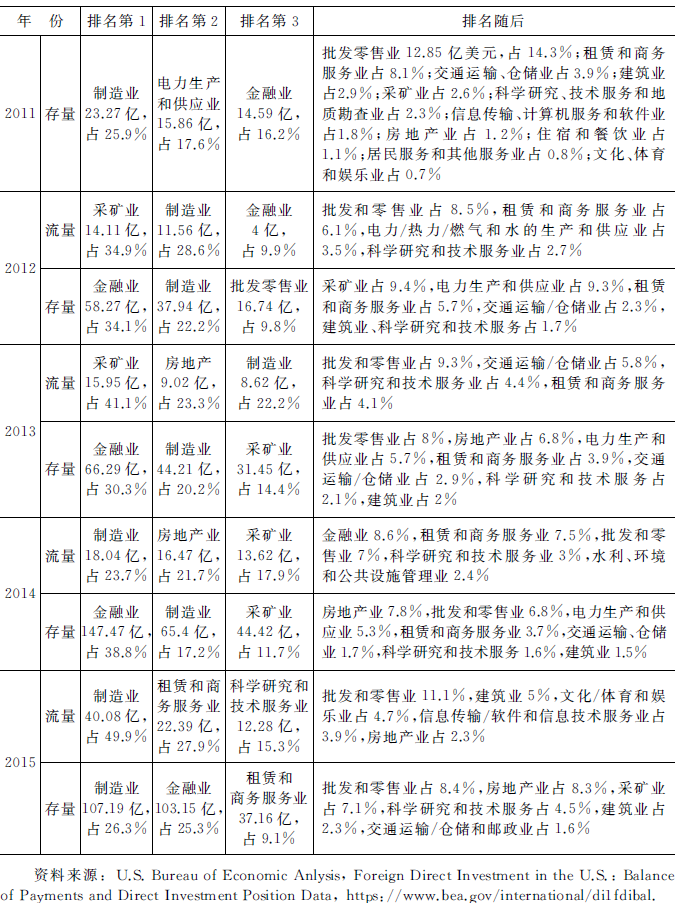 从行业来看,2011年—2015年中国对美直接投资的流量和存量中,制造业和金融业均占有较大比重,在绝大多数年份中排名位居前三。值得注意的是,科学研究和技术服务业曾经在流量和存量中占比较低,绝大多数年份低于5%。然而2015年中国对美直接投资中,科学研究和技术服务业的金额快速突破,总额达12.28 亿,占当年流量比为15.3%、位居第三。