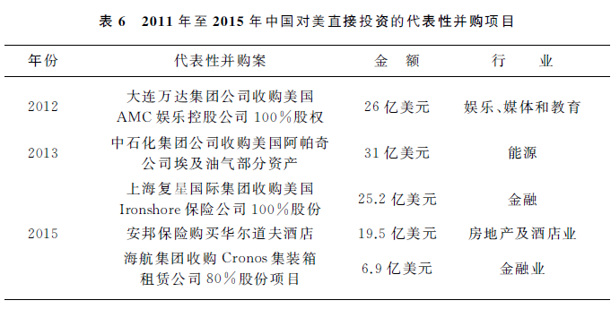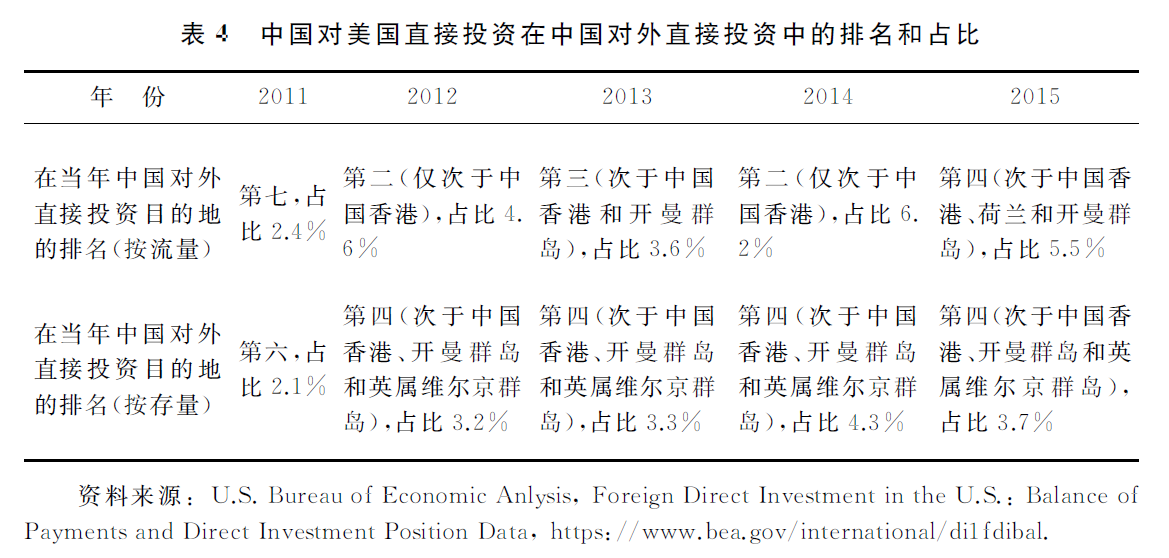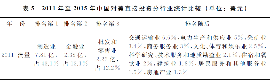 同期,对美国直接投资逐渐成为中国对外直接投资中的最主要目的地。从流量来看,2011年对美直接投资在中国对外投资目的中排名第七、占比2.4%,2012年排名跃升至第二、占比4.6%,2013—2015年排名也居于前四名之内。从存量来看,截至2011年对美直接投资在中国对外投资目的中排名第六、占比2.1%,2012年排名则跃升至第二、占比3.2,次于香港、开曼群岛和英属维尔京群岛,实际位列中国对主要发达国家对外直接投资的首位,2013年—2015年这一排名稳定不变。